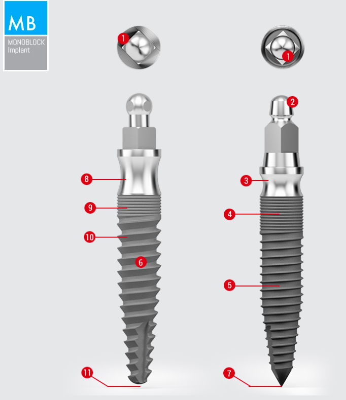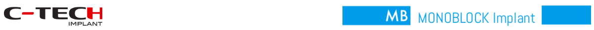 Mono Block to jednoczęściowy implant o średnicy 3 mm. System oferuje 2 opcje protetyczne; Głowica kulista do wyjmowanej pełnej protezy, a także zwężającego się zaczepu do koron i mostów.