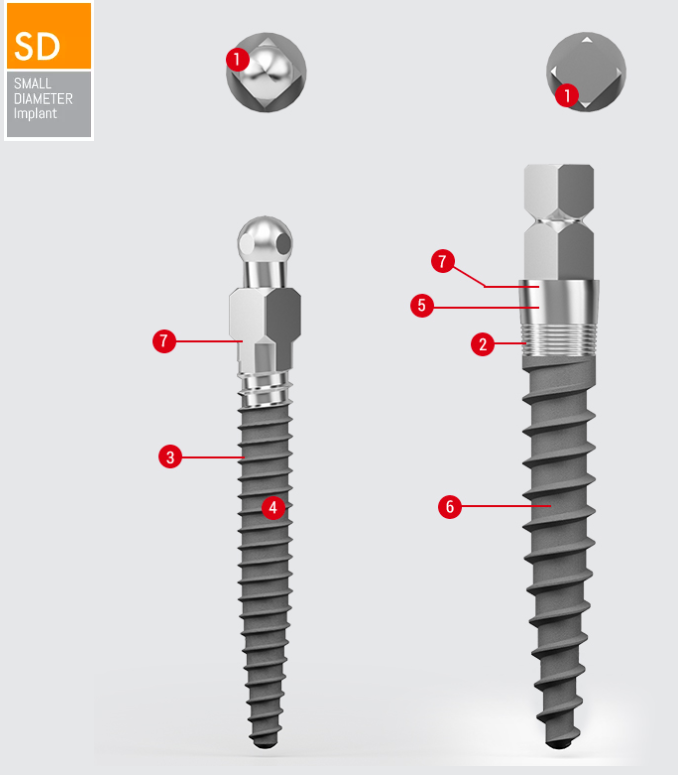 System implantów dentystycznych o małej średnicy to rodzina implantów jednoczęściowych o różnych średnicach 1,8 mm, 2,1 mm, 2,4 mm i 2,5 mm. Opcje dla każdej średnicy gwintu agresywnego, drobnego gwintu, kołnierza i bez kołnierza, główki kulistej i główki kwadratowej; sprawiają, że jest to jedna z największych serii mini implantów dentystycznych na rynku.